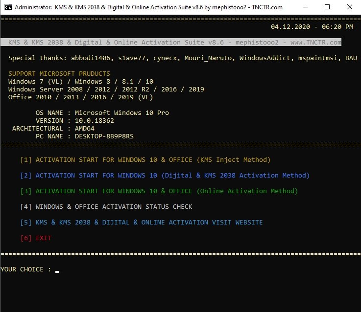 KMS/2038 & Digital & Online Activation Suite คือตัว Activation เปิดใช้งาน Windows และ MS Office เป็นของแท้ สามารถเปิดใช้งาน Windows OS หรือ MS Office ทุกเวอร์ชั่น ง่ายๆ เป็นเครื่องมือที่ไม่มีไวรัส สามารถวางใจในเครื่องมือนี้ได้เลย ตัวนี้สามารถทำการ Activate ได้ถึง 4 รูปแบบ คือ KMS Inject, Digital, KMS 2038 และ Online activations